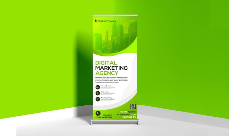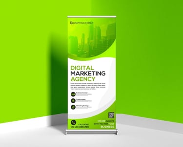 Roll up banner praktis dan mudah dipasang, cocok untuk promosi acara atau pameran dengan hasil cetak yang tajam dan tahan lama.